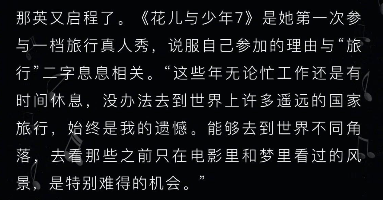 近日,那英在受访时分享了加盟《花儿与少年 7》的初衷,直言核心原因与“旅行” 紧密相关。她表示,能借节目契机去往世界不同角落,对自己而言“是特别难得的机会”。