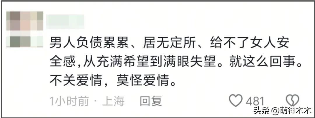 虽然李亚鹏和海哈金喜没有公开离婚原因,但明眼人都看得出二人婚姻问题所在,“男人负债累累、居无定所、给不了女人安全感。从充满希望到满眼失望。就这么回事,不关爱情,莫怪爱情。”