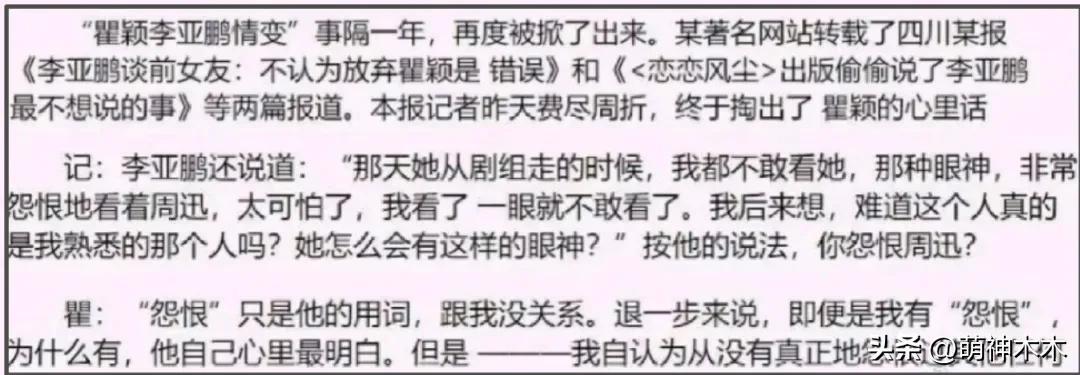 ——瞿颖被分手了跨城找朋友哭诉,周迅被分手了抑郁许久,李亚鹏和瞿颖、周迅纠缠期间,还有过一篇经典报道,李亚鹏竟然暗示记者,瞿颖非常怨恨周迅,来了一句:“……我都不敢看她,那种眼神,非常怨恨地看着周迅,太可怕了……”