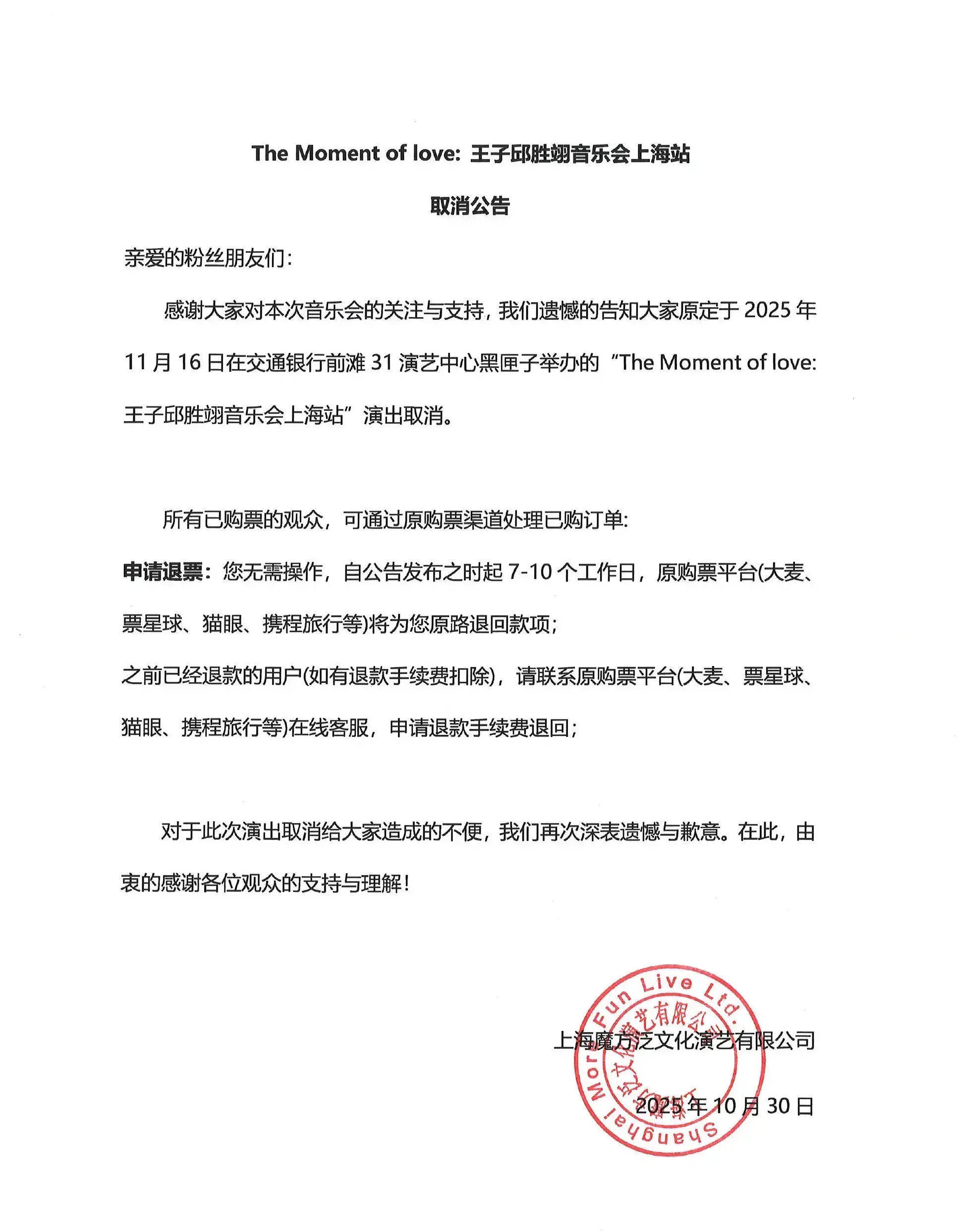 主办单位“魔方演艺”发布公告称:“我们遗憾地告知大家,原定于2025年11月16日举办的‘王子邱胜翊音乐会上海站’演出取消。所有已购票观众可通过原购票渠道办理退票。”