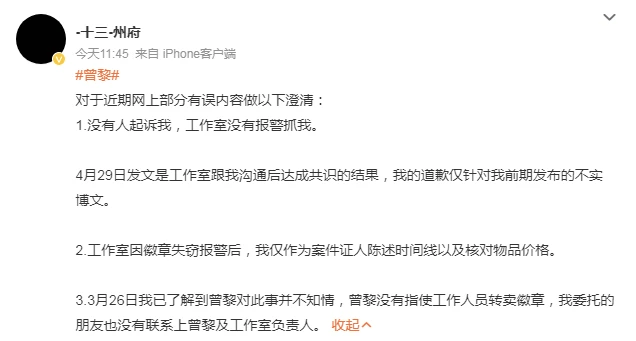 曾黎的灾难公关还在继续,5月2日,送礼物的粉丝发文回应曾黎事件,直言曾黎工作室因为徽章失窃而报警,自己则是作为案件证人陈述时间线以及核对物品价格,并再次表示曾黎对此并不知情,没有指使工作人员倒卖徽章,或许曾黎方面觉得这样的公关方式很成功,毕竟是送礼物的粉丝进行的澄清,结果曾黎方此次的回应越描越黑。
