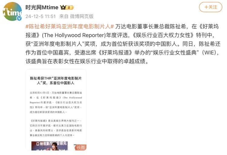 2024年初,陈祉希宣布就职万达电影第六届董事会董事长,以及公司法定代表人。主导万达影业的经营事物,成为中国影视圈第一梯队的权力女性。