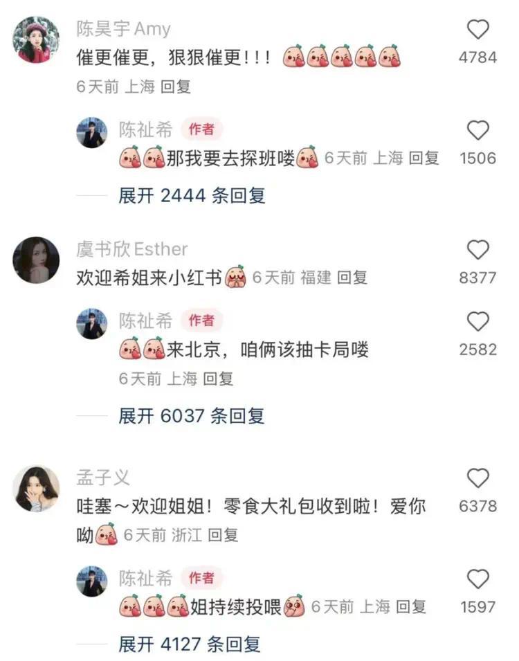 陈祉希今年开了小红书,评论区出现了各种各样的“抱大腿”,关晓彤、沈月、虞书欣、李昀锐、周也、孟子义等一众年轻明星都来围观打call。