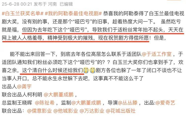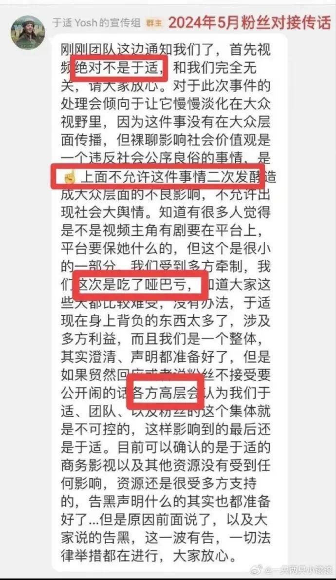 但粉丝群盛传,剧组及于适工作室基本上没有什么反应,是因为接到“上面的通知”,不允许反黑,所以于适粉丝都“吃了哑巴亏”,没有第一时间出来反驳黑料,导致于适一直背着黑锅,于适粉丝“一直抬不起头来”。