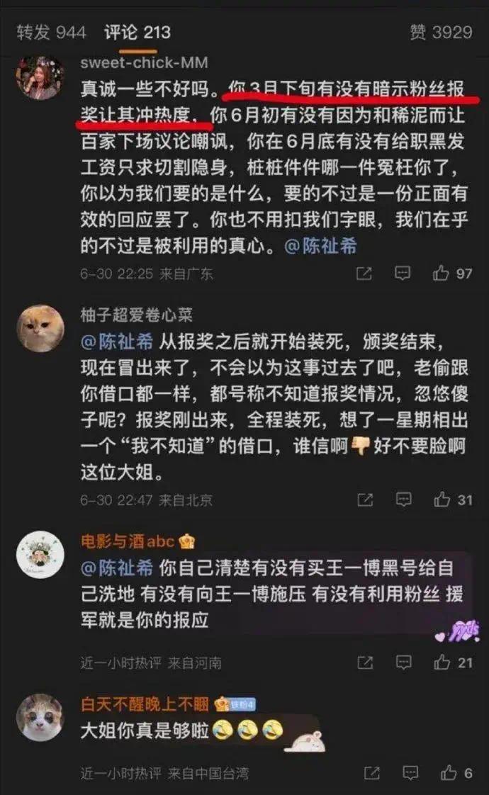 粉丝的愤怒又转嫁到陈祉希头上,认为她依靠王一博赚钱又赚名,吃着王一博的红利,却对真正的贡献者王一博本人并不照顾。王一博粉丝声讨陈祉希: