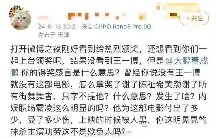 后来大家又跑到大鹏那里不满,说大鹏感谢了一堆人,尤其第一个感谢了“希姐”,却只字不提王一博。