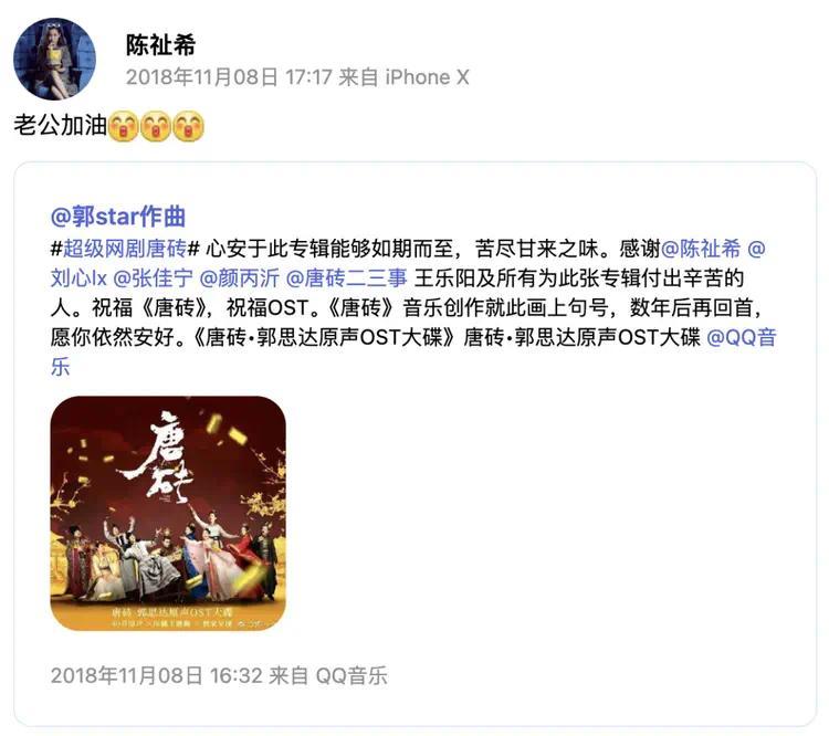 郭思达的作曲实力不容小觑,助力过不少陈祉希公司的项目。同时,他和程耳导演的关系也很不错,所以陈祉希有时甚至蹭老公的光去看电影。两人在工作上能够互相补益,文艺军人之家和神秘富豪二代,也算强强联手了。