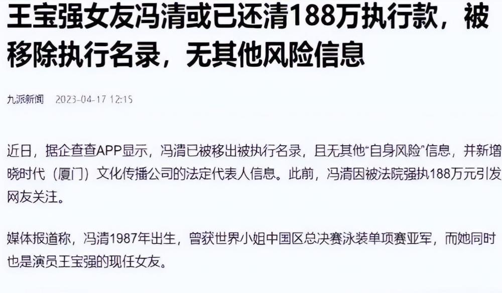 但后来,冯清被移出被执行名录并且没有其他的“自身风险”信息了,所以有很多网友都猜测,会不会是王宝强帮她还清了这笔钱。