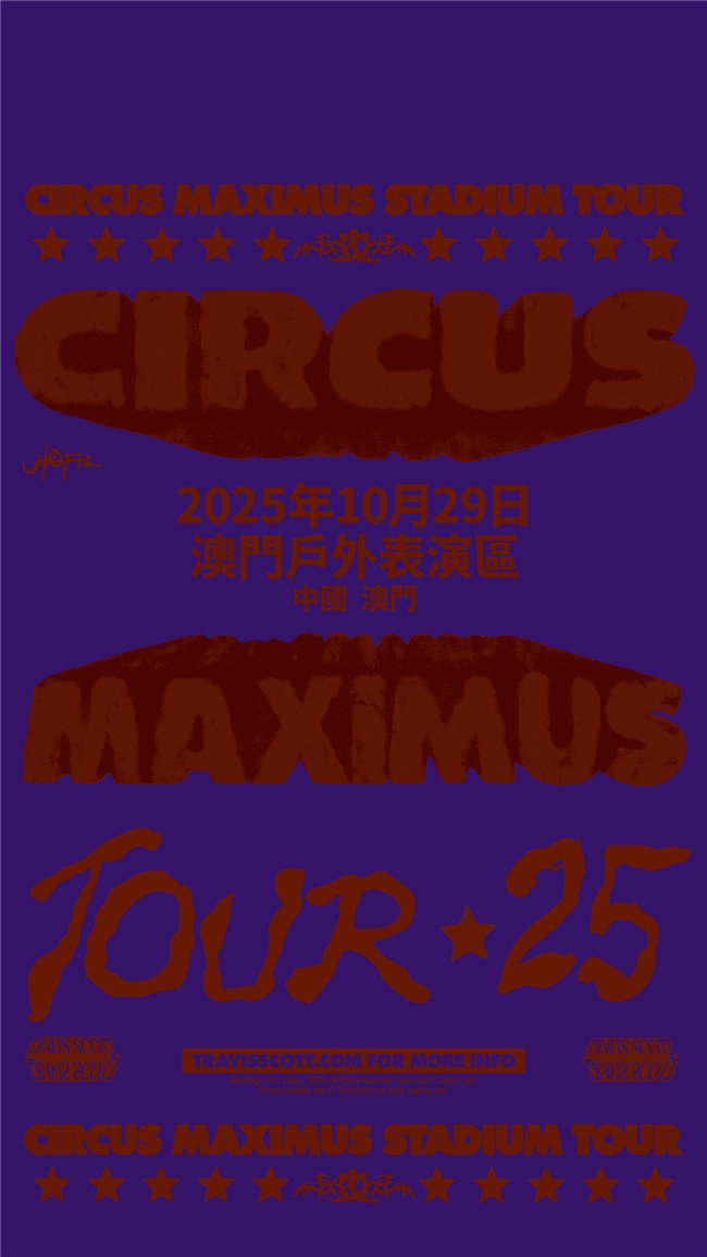 全球音乐界的超级巨星Travis Scott今日宣布,其创纪录的「Circus Maximus」世界巡回演唱会即将登陆中国澳门,这场新增的国际巡演站次给了歌迷意外惊喜与热切期待,也预示着亚洲音乐演出市场迎来一个新的里程碑。2025年9月5日(星期五)中午12时,演唱会正式公开售票,届时可以通过澳门通/Mpay/大麦/cityline/携程等票务平台购票。2025年10月29日(星期三),全球统一巡演配置的「Circus Maximus」落地澳门户外表演区,全场站立演唱会氛围感加码,Travis Scott将为亚洲的歌迷们带来一场前所未有的史诗级视听盛宴。
