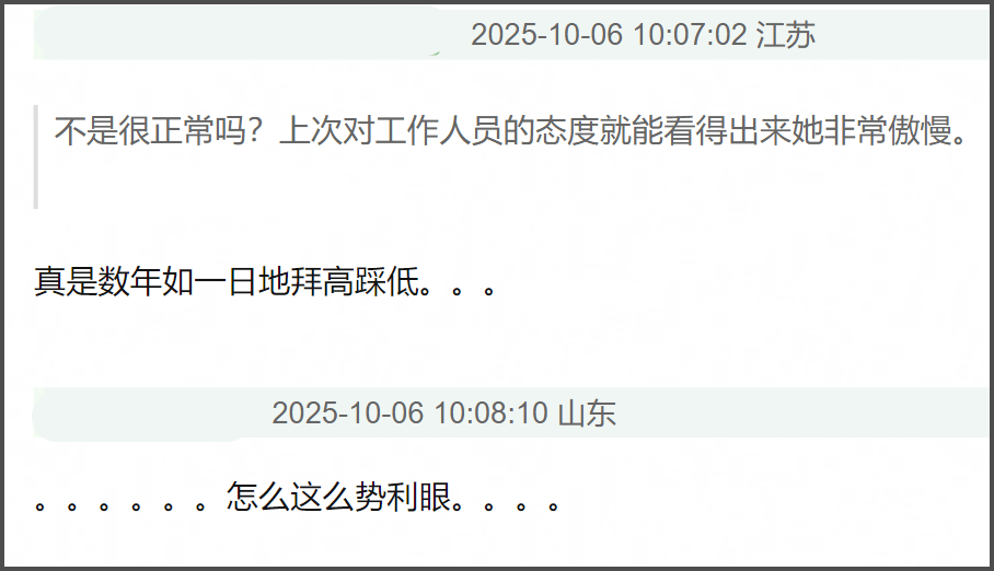 还有粉丝还试图澄清周也是对身边工作人员翻白眼不是对热巴,但拿出的证据却没有太大说服力。而且周也不止一次翻白眼,后续表情也不耐烦,网友表示不管是对身边工作人员或是其他人,在媒体和镜头众多的场合,周也的表情管理,和她以往营造出的形象更是半点不沾边。