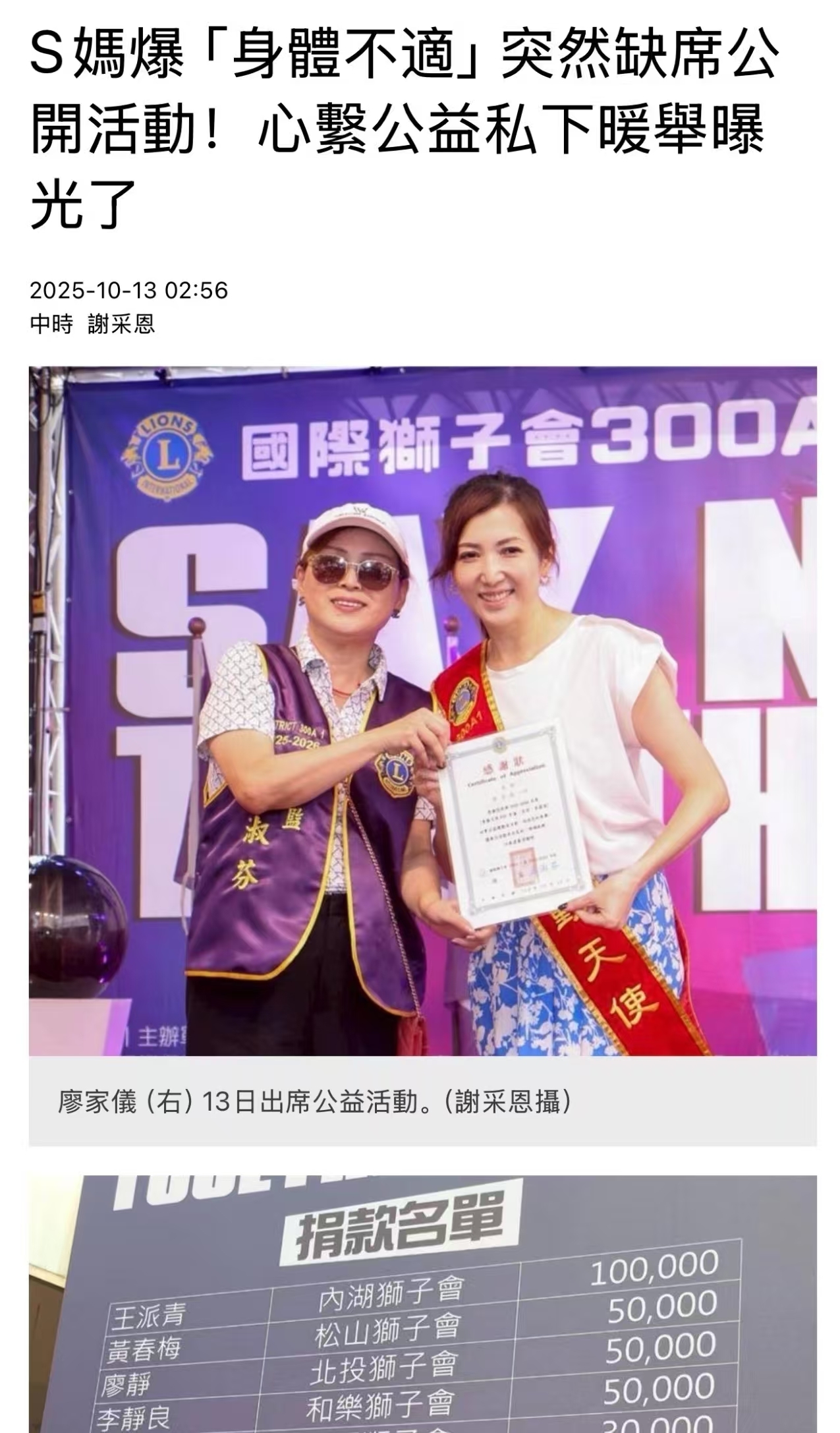 虽未露面,但S妈还是捐款5万新台币(约1.1万元人民币)支持公益项目。随后,S妈在接受电话采访时向大家报了平安,表示自己身体还好,只是看到了很多人会掉眼泪。她还称今年要做反网络霸凌的主席,希望再也不要有人在网络上莫名的恶意抹黑,造谣!
