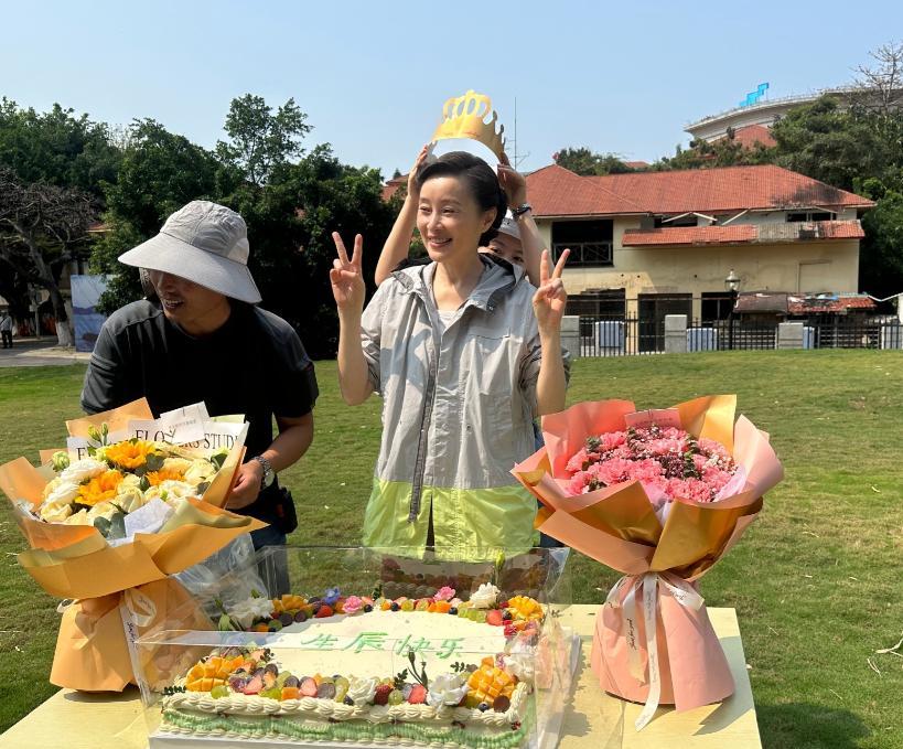生日那天,剧组气氛特别轻松。徐峥戴着假发,逗笑一屋子人;于和伟戴着蓝色鸭舌帽,安静地站在她身边。