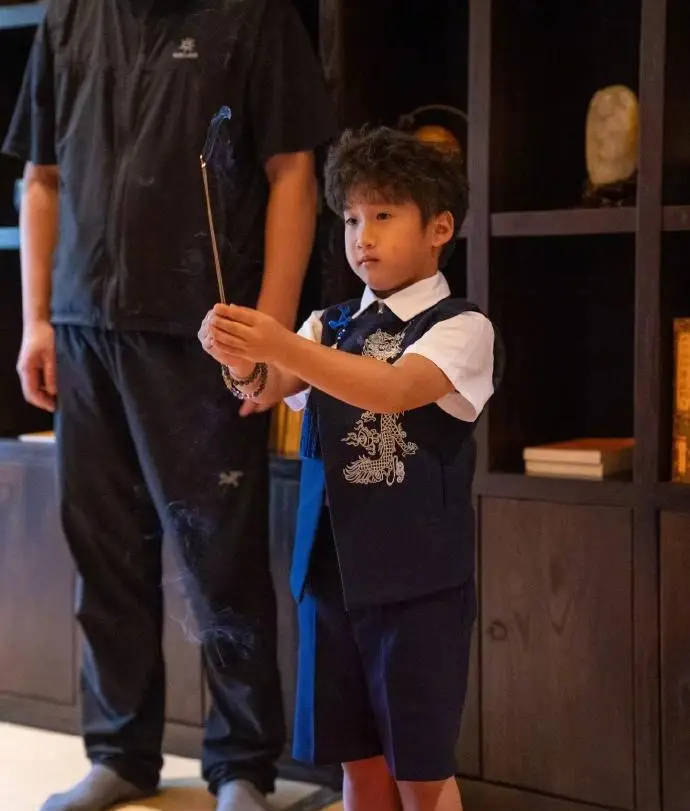 拜师仪式上,顶着一头羊毛卷的冉明羲身穿中式礼服,模样呆萌可爱。在庄重的氛围中,他双膝跪地,向师父恭敬奉茶,并获赐法名“释恒一”。仪式一结束,孩子的天真本性便流露出来,他对师父坦言:“师父,祝你教人愉快。因为我有点皮。”