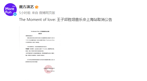 主办单位“魔方演艺”发布公告称:“我们遗憾地告知大家,原定于2025年11月16日举办的‘王子邱胜翊音乐会上海站’演出取消。所有已购票观众可通过原购票渠道办理退票。”