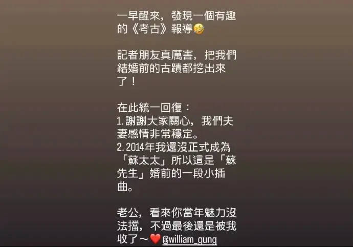 11月11日,苏永康太太回应“苏永康背妻密会女子”,她表示“记者朋友真厉害,把我们婚前的古迹都挖出来!”“谢谢大家关心,我们夫妻感情非常稳定。2014年我还没正式成为苏太太,所以这是苏先生婚前的一段小插曲。”