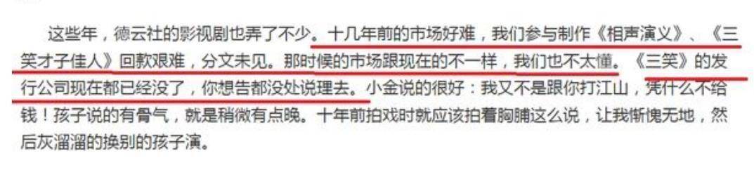 郭德纲的回应长文里提到了这件事,但他的辩解显然有问题,他先是卖惨,说他们参与制作的《相声演义》(《窦天宝传奇》的另一个名字)和《三笑才子佳人》回款困难分文未见。