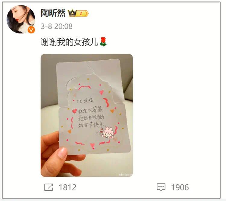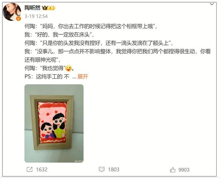 再看陶昕然近期的动态,3月8日晒出了女儿给自己写的小卡片;3月19日分享了一则和女儿的对话,女儿让陶昕然出差带上自己画的画,画像只有陶昕然母女,不见何建泽。