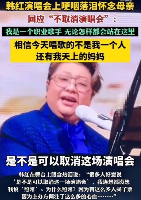 4月26日成都演唱会现场,韩红追忆刚离世的母亲,情难自禁哽咽发声。“13天前,我的母亲离开了。很多人好意说,‘是不是可以取消这一场演唱会’,我连想都没想,我说‘照常’。为什么照常?因为有这么多人买了票,因为主办方倾注了这么多的心血……我是一个职业歌手,无论怎样都会站在这里。13天前我的母亲离开,但我相信今天唱歌的不是我一个人,还有我天上的妈妈。”