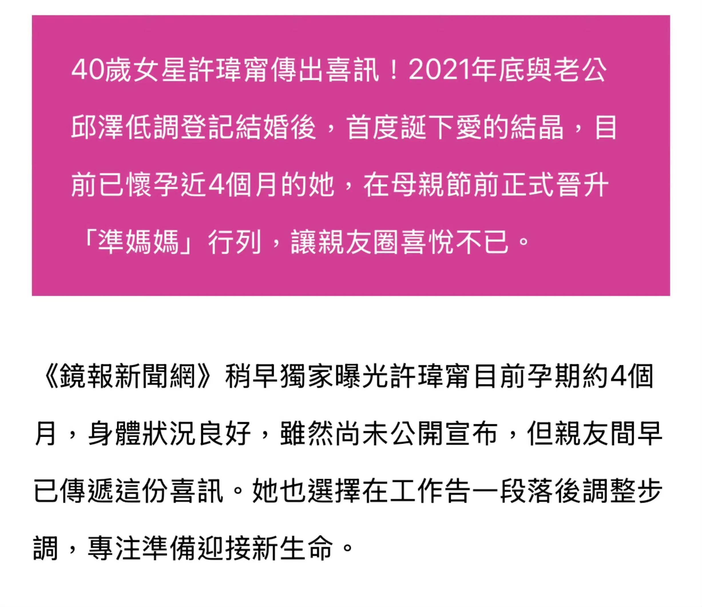 此外,许玮甯最近拍摄的一组杂志大片中,她脸上洋溢着红润的光泽,愈加散发出母性的光辉,展现出温柔与坚韧并存的魅力,令人感受到她即将成为母亲的喜悦与期待。