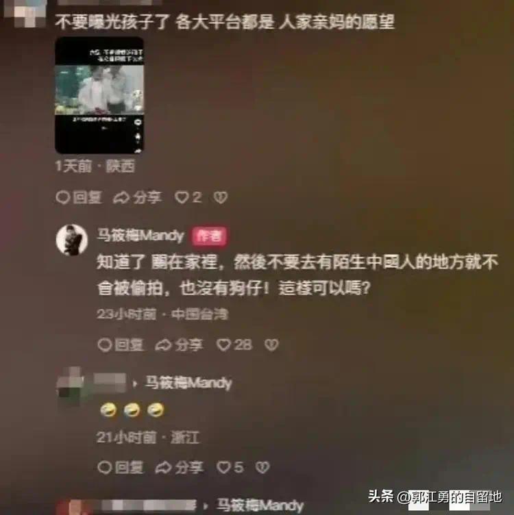 言下之意指责马筱梅一个后妈,每天带着孩子招摇过市,一点都不避讳,还特意强调孩子亲妈大S一直不喜欢曝光孩子,让马筱梅尊重亲妈遗愿。