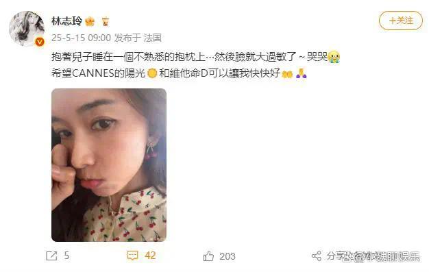 不过本来是好事,但是她在网上分享了一个挺“接地气”的日常小状况,配的文字带着她招牌的娃娃音语气,她说自己“抱着儿子睡在一个不熟悉的抱枕上……然后脸就大过敏了,哭哭。”接着还表示“希望戛纳的阳光和维生素D可以让我快快好。”