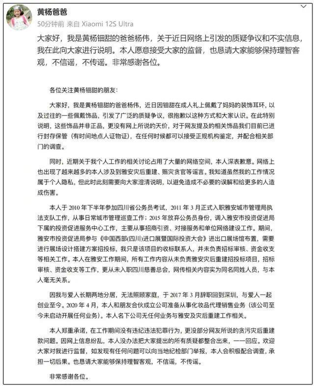 事件发酵后,黄杨钿甜父亲率先回应。