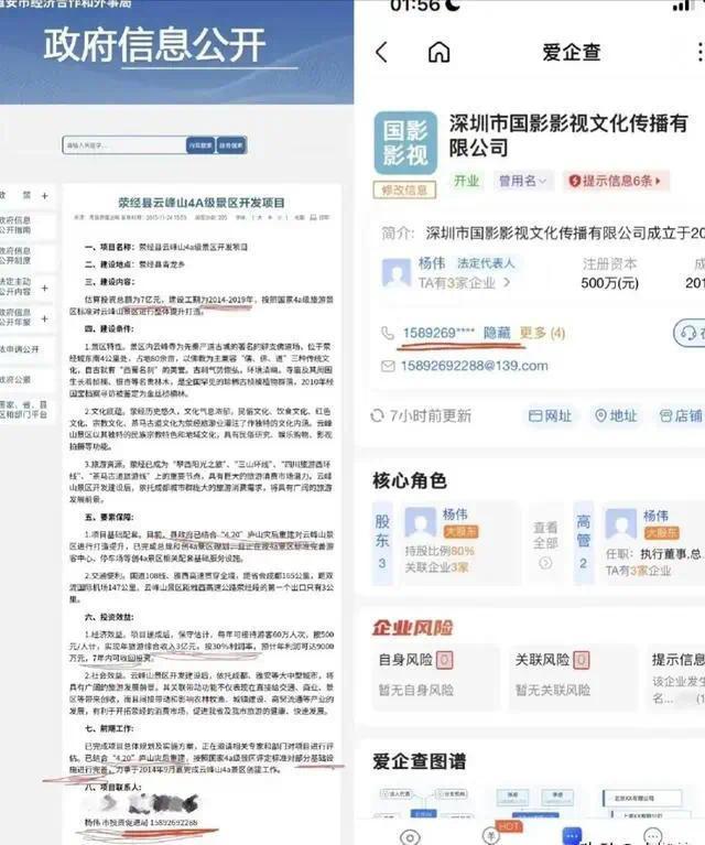 然而雅安市经济合作和外事局网站2015年发布的政府信息公开信息显示,荥经县云峰山4A景区开发项目涉及4·20芦山地震灾后重建,投资总额约7亿元,项目联系人正是杨伟,电话号码与杨伟下海经商后所用号码一致。