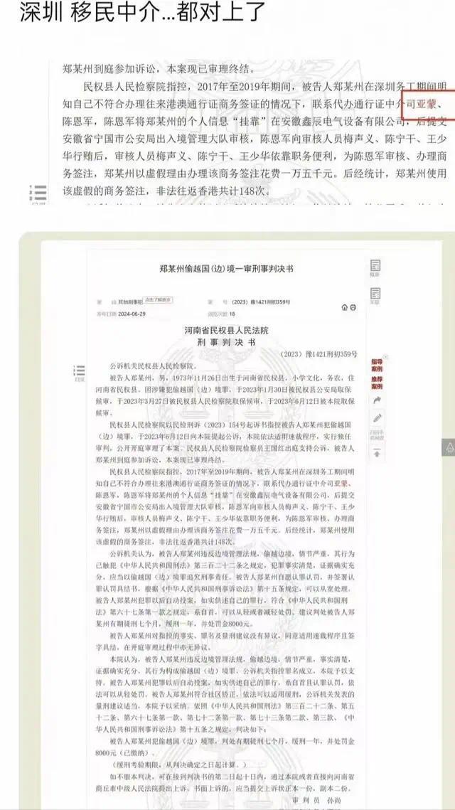 据判决书,通过司亚蒙所在中介办理的非法签证,郑某某非法往返香港148次,办理费用高达1万多元,远超正常签证费用,利润惊人。