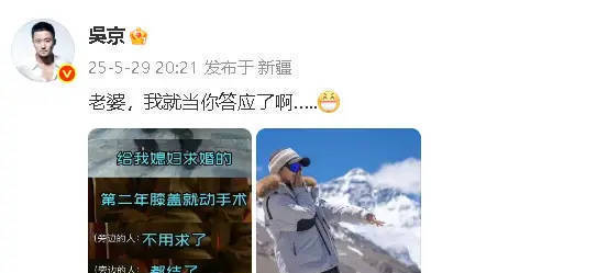 5月29日,吴京在社交平台晒出自己和妻子谢楠的两张照片,并配文“老婆,我就当你答应了”。他在自己的照片中透露,原本打算在珠穆朗玛峰向妻子求婚,却因次年膝盖受伤未能实现。当有友人提醒他已结婚无需再求婚时,吴京坚持表示“意义不一样”。而谢楠的照片中,她伸出左手无名指,摆出仿佛要接受戒指的姿势,尽显甜蜜。