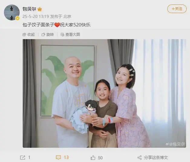 近日,包贝尔在社交平台晒出一家四口合照,宣布二胎出生,配文 “包子饺子面条子祝大家 520 快乐”,引发网友热议。妻子包文婧也转发称 “一家四口”,喜悦之情溢于言表。