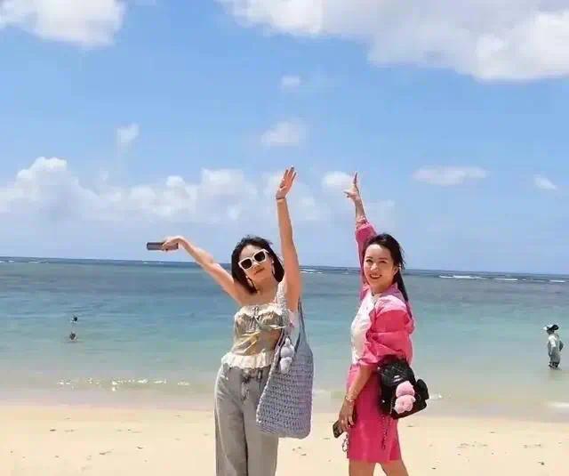 此次出行两人都异常开心,在海边玩游两人共同时拍照笑容满满,完全看不出两人都是孩子的妈妈了。