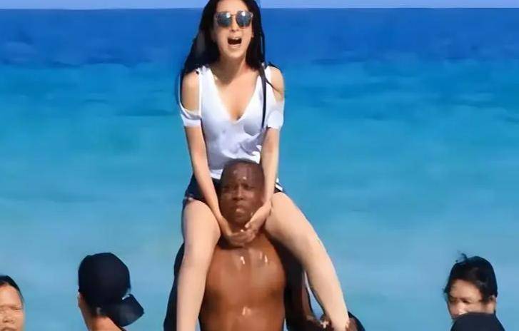照片中,马苏穿着清凉,笑容满面地被黑人男子驮在肩上,两人看起来十分亲昵。