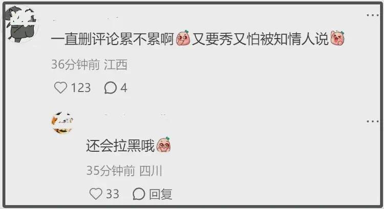 面对着网友们越来越犀利的评论,不知道是心虚,还是小气,尔冬升的女友频繁删除令她觉得刺眼的评论,很多网友吐槽自己的评论被删了,还有网友一针见血地指出对方是“又要秀又怕被知情人说”,直接戳破尔冬升女友的心思。