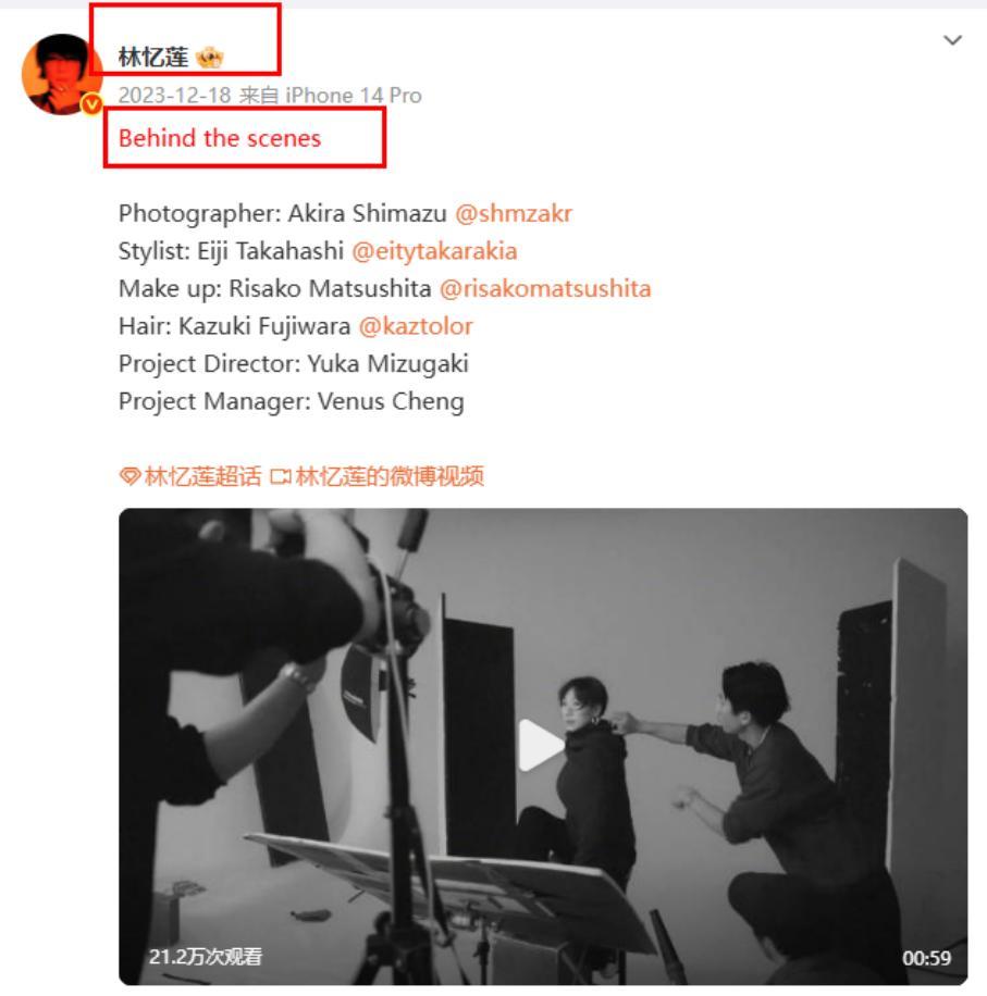 她在微博上发布了一条名为 “Behind the scenes” 的动态及相关短视频。